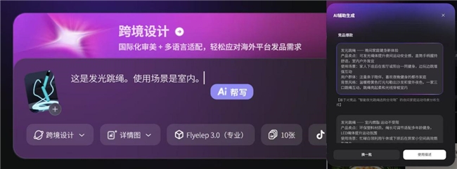 最核心的部分是描述框,但这里的创新在于:你甚至可以不写描述。Flyelep AI内置的“AI帮写”功能,会基于你的产品名称自动分析网络热点、竞品数据和平台趋势,生成四套不同的文案方案。