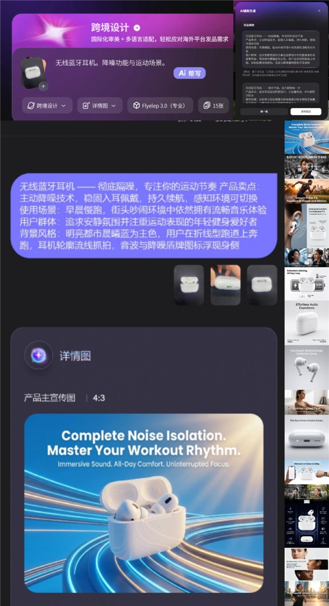 为了验证Flyelep AI的实际效率,我们进行了一次完整测试。选择一款蓝牙耳机作为测试产品,目标平台为亚马逊美国站,语言选择英语。